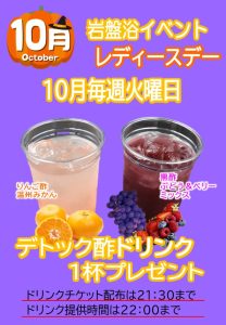 🍁10月もまだまだ楽しもう!🍂💆♀️毎週火曜日はお待ちかね、レディースデーを開催します!女性のお客様には嬉しい特典付き💖岩盤浴をご利用いただいた際には、体の中からリフレッシュできるデトック酢ドリンクを1杯プレゼント🍹✨2種類の風味豊かなドリンクからお好きな方をお選びください!どちらを選んでも、心も体もリフレッシュ間違いなし!🌼
