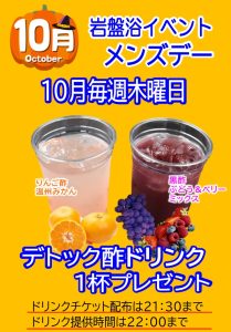 🌟毎週木曜日は「メンズデー」!男性のお客様に特別なサービスをご用意しております。岩盤浴をご利用いただくと、デトック酢ドリンクを無料で1杯プレゼント🎁🍹。2種類のフレーバーからお好みのものをお選びいただけますので、新たな爽やかさを体験してください!