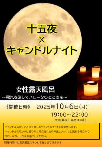🌕✨女性の皆様、お待たせしました!🌟10月6日、茶の湯では特別な「十五夜キャンドルナイト」が開催されます。✨👘露天風呂限定で、美しいキャンドルの灯りと共に秋の夜空をお楽しみください。🌿🍁目で癒される空間、心も体もリフレッシュするひとときをお届けします。🌸🛀