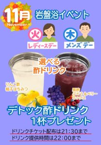 11月岩盤浴イベント(火曜・木曜) 2025 11/01 イベント ニュース・お知らせ イベント ニュース・お知らせ この記事が気に入ったら いいねしてね! よかったらシェアしてね! URLをコピーしました! URLをコピーしました!