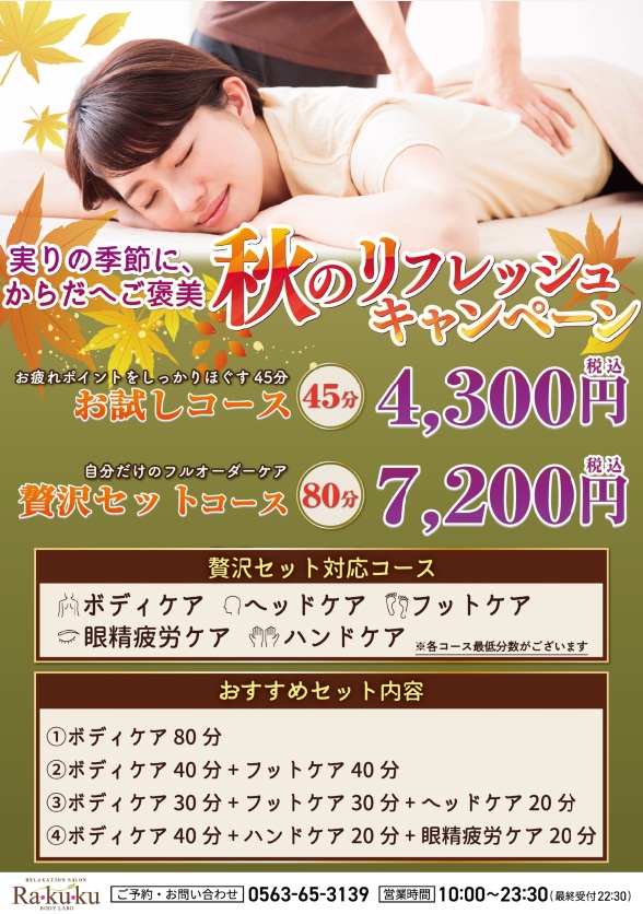 秋のリフレッシュキャンペーン 2025 11/01 イベント ニュース・お知らせ イベント ニュース・お知らせ この記事が気に入ったら いいねしてね! よかったらシェアしてね! URLをコピーしました! URLをコピーしました!