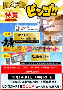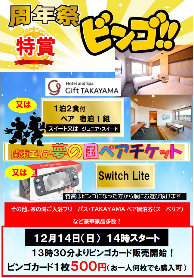 楽しさと興奮が詰まった『周年祭ビンゴ大会』を開催いたします🎉!12月は特別な景品が揃っていますので、ぜひご参加ください。特賞にはTAKAYAMAペア宿泊チケット(2食付)、夢の国ペアチケット、そしてSwitch Liteが並んでいます✨。ビンゴで当たった方から順に、お好きな景品を選んでいただけます🎁。