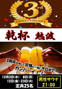 周年祭イベント『乾杯熱波』がいよいよ開催されます!🎉この特別なイベントは、男性サウナ室でのアウフグースセッションの前に行う「オロポ乾杯」でスタートします。お客様とスタッフが一体となり、オロポを手に皆で乾杯をしましょう!🥂✨その後、アウフグースによるパフォーマンスで熱波体験が待っています。🔥🌿