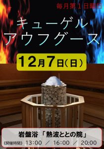 12月7日、特別な時間を過ごしませんか?✨岩盤浴熱波ととの院にて、素晴らしいキューゲルアウフグースを開催いたします。🧖♂️🧖♀️時間は13時、16時、20時の3回です。サウナストーンに氷をのせ、溶けていく様子をじっくりとご覧いただくことで、心安らぐひとときをお楽しみいただけます。🧊✨この特別な体験は、ストレスを解消し、あなたを心地よいリラックスの世界へと誘います。🌿