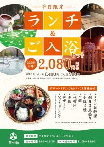2月2日から27日までの平日限定で、特別な『ランチ&ご入浴』セットがスタートします!このセットを利用することで、入浴のついでにお得にランチを楽しむことができます♪温泉でリラックスした後、美味しいランチをお楽しみください。